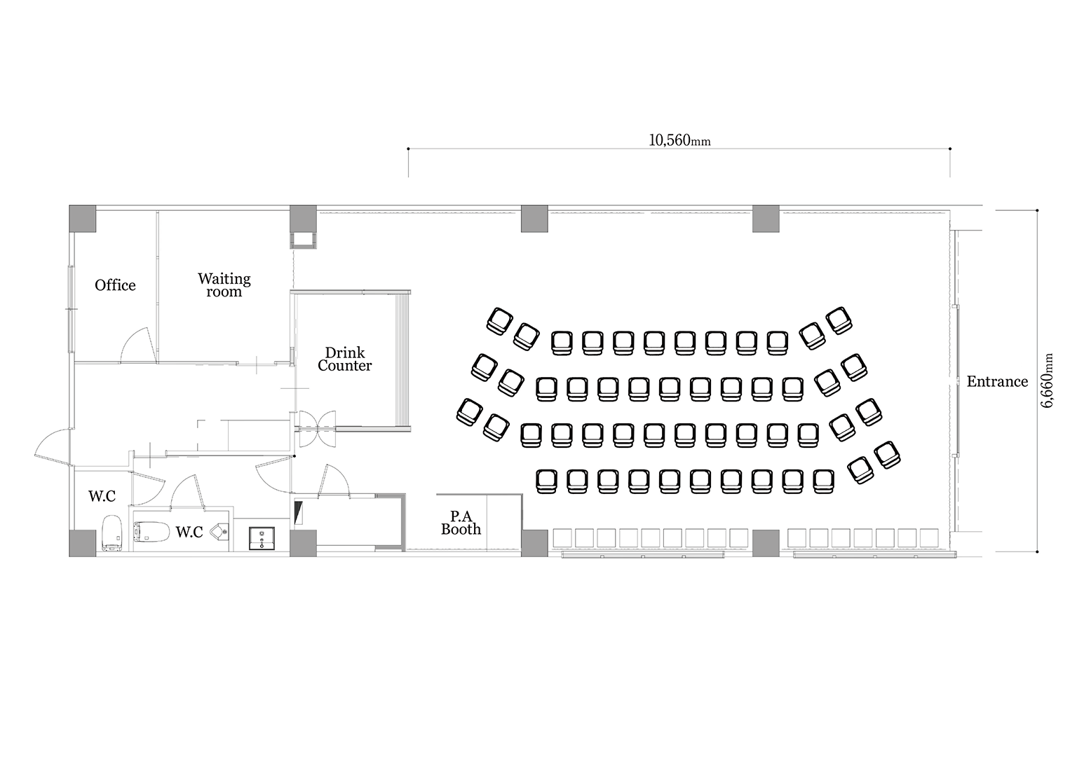 北ノ庄クラシックスの会場レイアウトと、常設機材・備品の一覧です。音響・照明・映像などの設備を整え、ライブ、トーク、展示など多彩なイベントに対応しています。ご利用目的に応じて、最適な機材セットアップをご案内いたします。